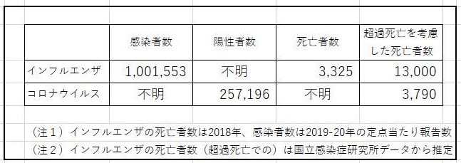 陽性者数と感染者数は全く異なっていることを我々はきちんと認識する必要がある。そうでないと、コロナウイルスがインフルエンザなどに比較して、多くの感染者が出ているように多くの人が勘違いしてしまう。(実際にはこういう数え方をしても、流行期のインフルエンザよりも少ない数字なのだが)