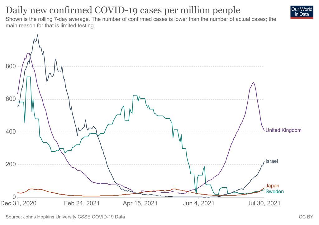 6月末頃から、英国とイスラエルで死者数が増えてきている。これに対してスウェーデンは増えていない。(日本はここ数日は死亡者数が増えているようになっているが、実際のところは増えていないので、なにかデータの取り違えではないかと思っている。)